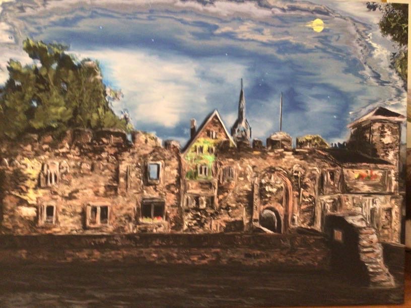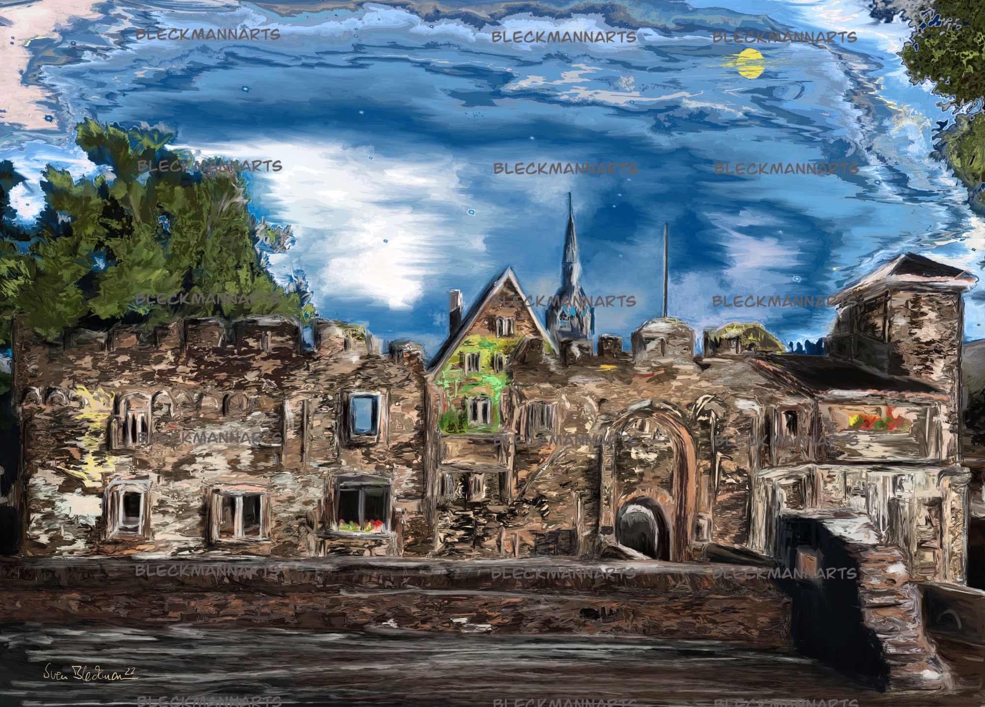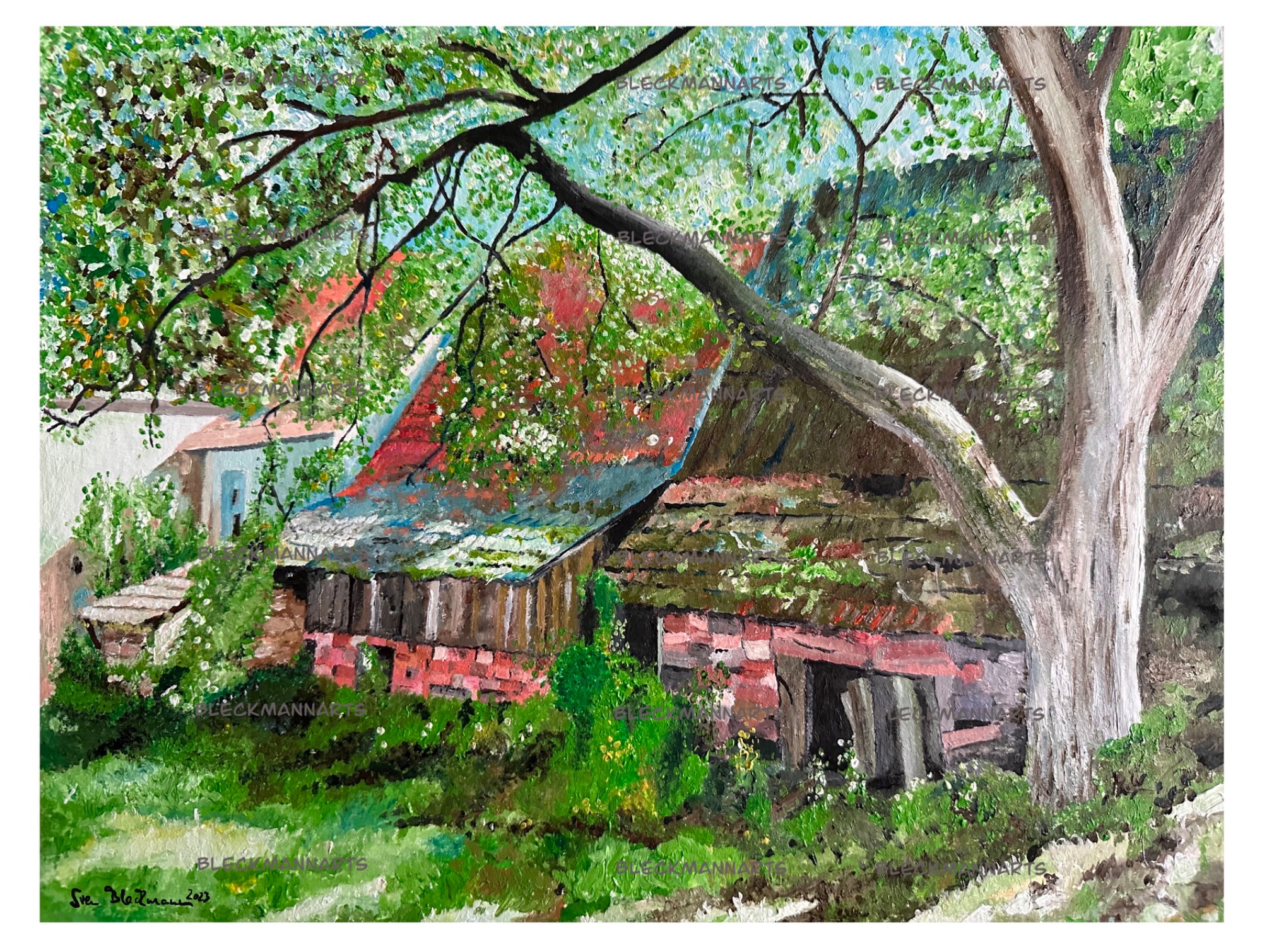 Der Bauernhof am Neckar, den gibt es wirklich! Akryl im Original VERKAUFT. Als Edel-Druck erhältlich. In Wunschgröße.